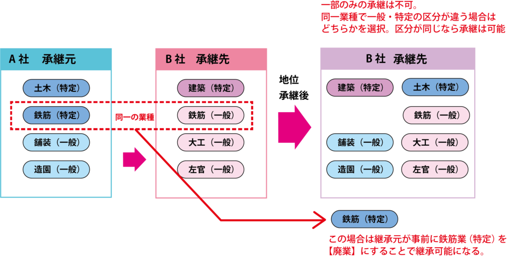 また、両社が同一の業種を保持している場合は、「一般」と「特定」の許可を同時に持つことはできないという大原則があるため、どちらか一方の業種を事前に一部廃業し、区分を揃えることで承継が可能になります。