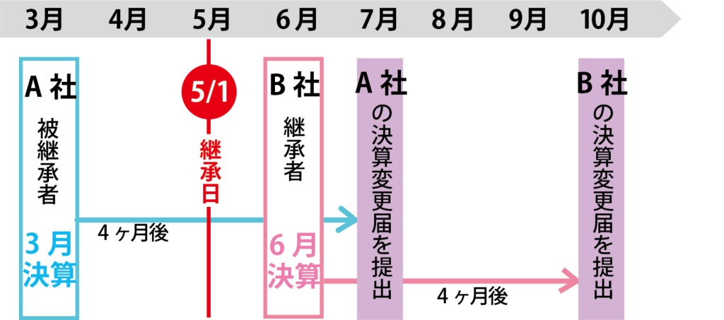 (具体例:5月1日に承継した場合) 3月決算のA社を、6月決算のB社が承継したケースを例に挙げます。承継時点でA社の直近決算(3月期分)が未提出であれば、B社はまず7月末までにA社の報告を済ませ、その後10月末までに自社(B社)の決算報告を行う必要があります。