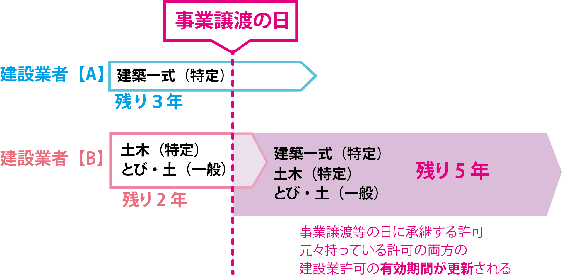 | 事業譲渡 | 建設業許可業者を含む複数の事業者間で、建設業に関する事業の全部譲渡が行われる場合(個人から法人への法人成、法人廃業からの個人事業主開業を含む※) | 承継者=譲受人 被承継者=譲渡人 |