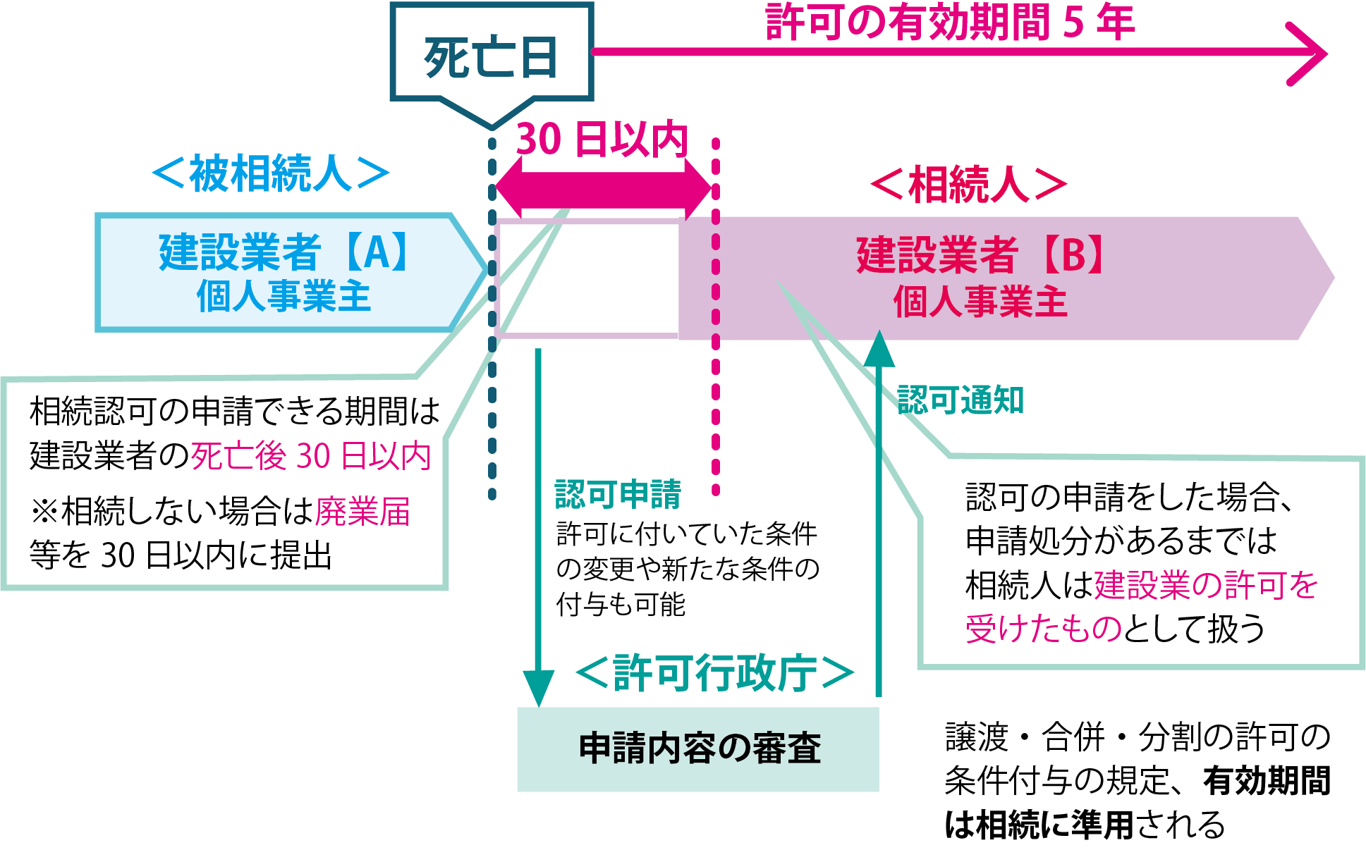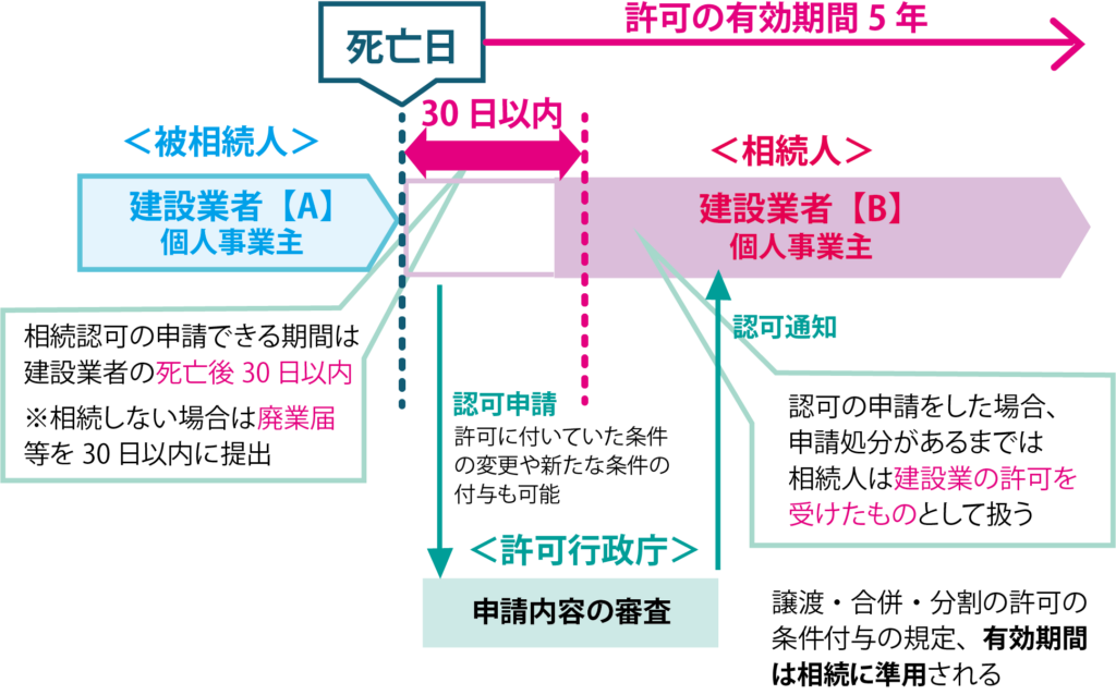 事業承継を行う場合はあらかじめ事前の許可を受けること、相続の場合は死亡後30日以内に相続の許可を受けることで、空白期間を生じることなく、承継者(譲受人、合併存続法人、分割継承法人。以下同じ)及び相続人が、被承継者(譲渡人、合併消滅法人、分割被承継法人。以下同じ)及び被相続人の建設業者としての地位を継承することが可能になりました。