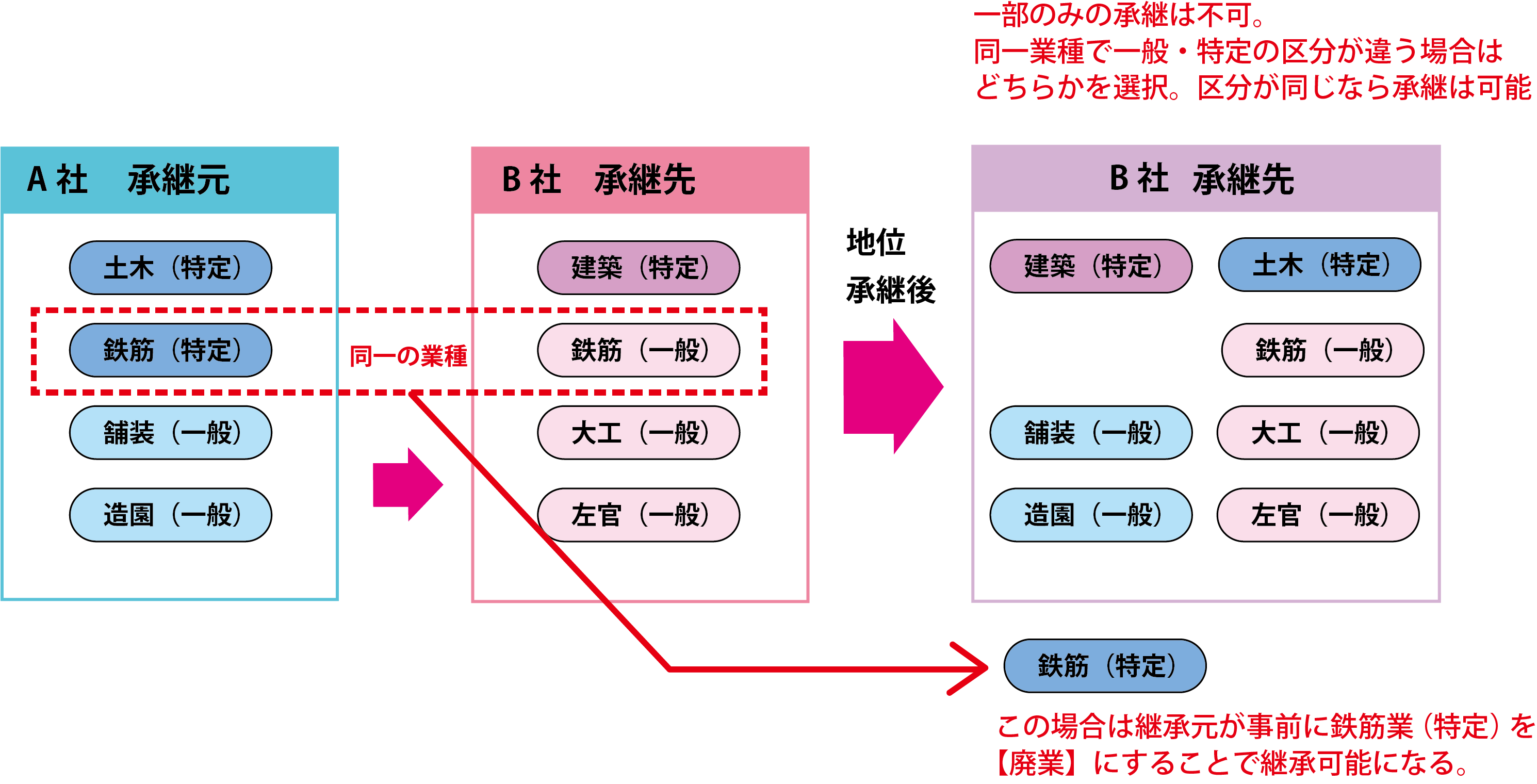 また、両社が同一の業種を保持している場合は、「一般」と「特定」の許可を同時に持つことはできないという大原則があるため、どちらか一方の業種を事前に一部廃業し、区分を揃えることで承継が可能になります。