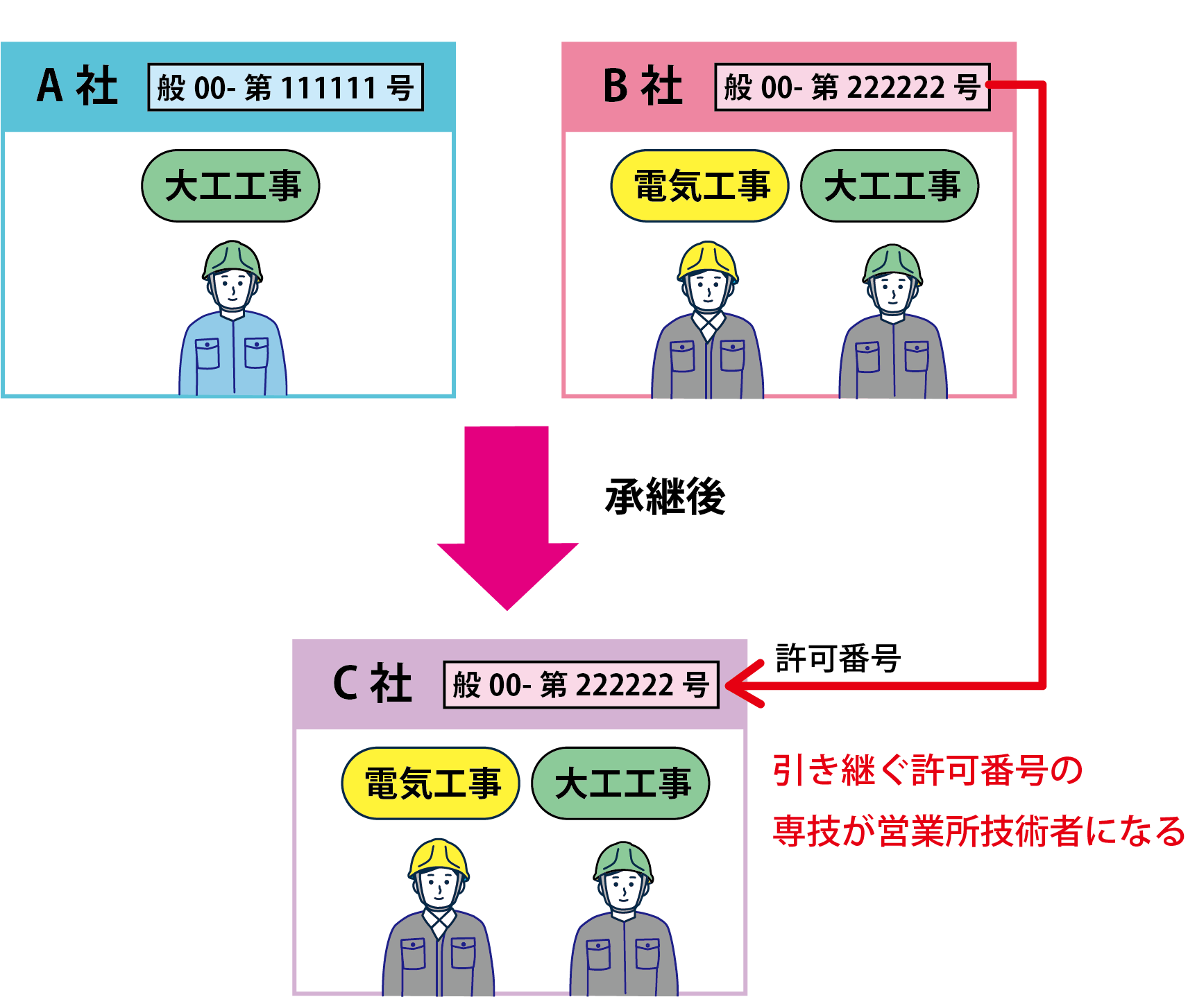 - 電気工事: B社の専任技術者が、承継後もそのままの体制で引き継がれます。
