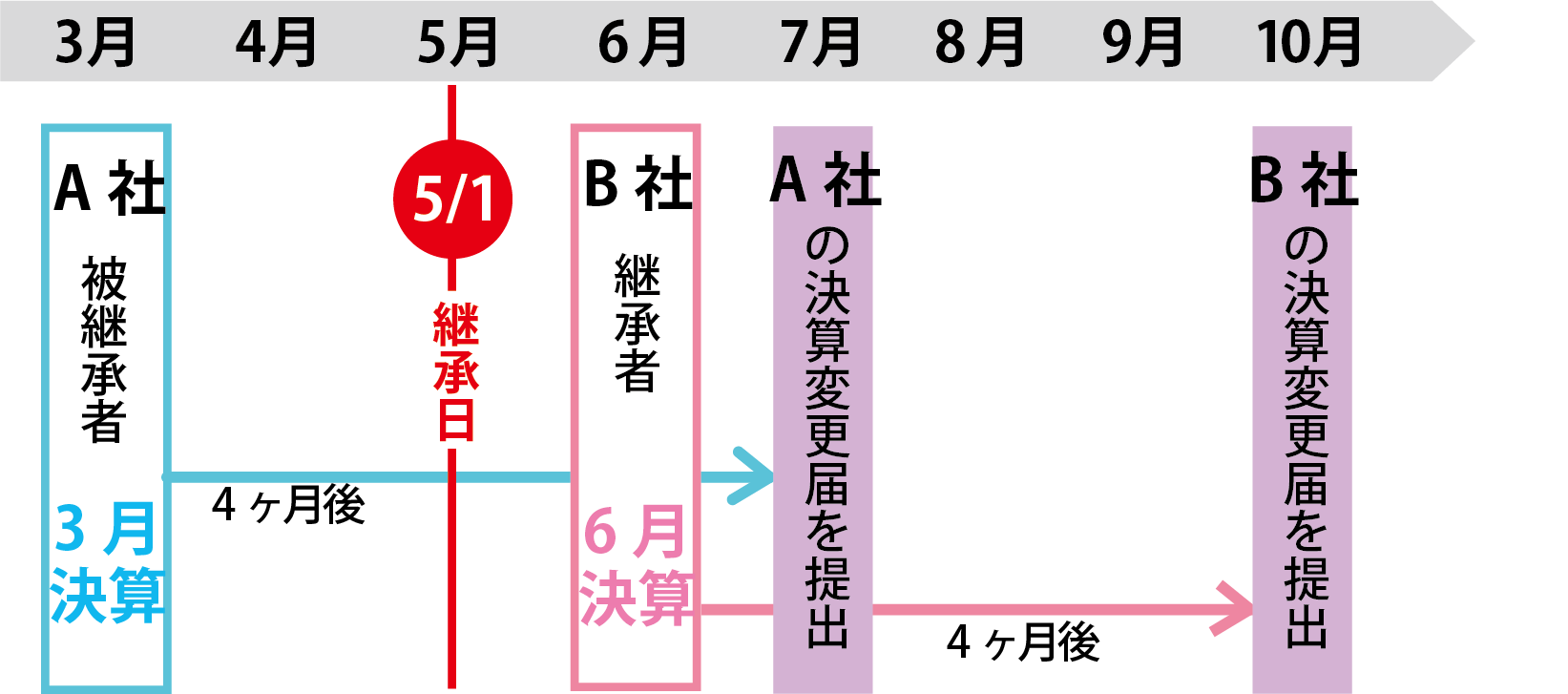 (具体例:5月1日に承継した場合) 3月決算のA社を、6月決算のB社が承継したケースを例に挙げます。承継時点でA社の直近決算(3月期分)が未提出であれば、B社はまず7月末までにA社の報告を済ませ、その後10月末までに自社(B社)の決算報告を行う必要があります。