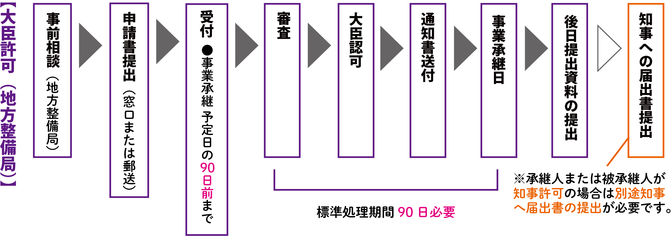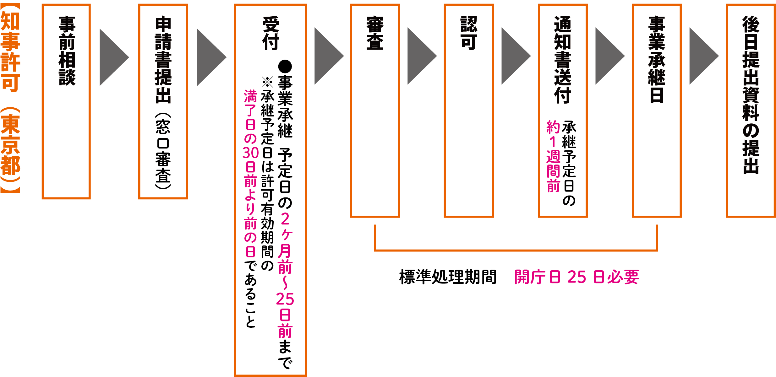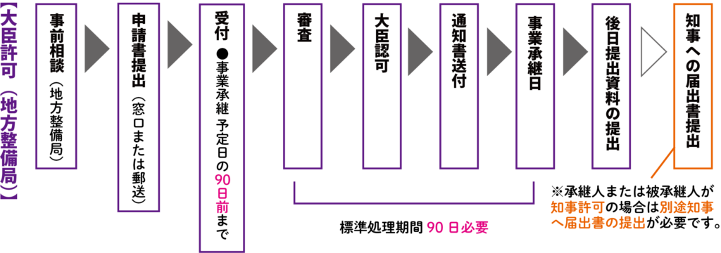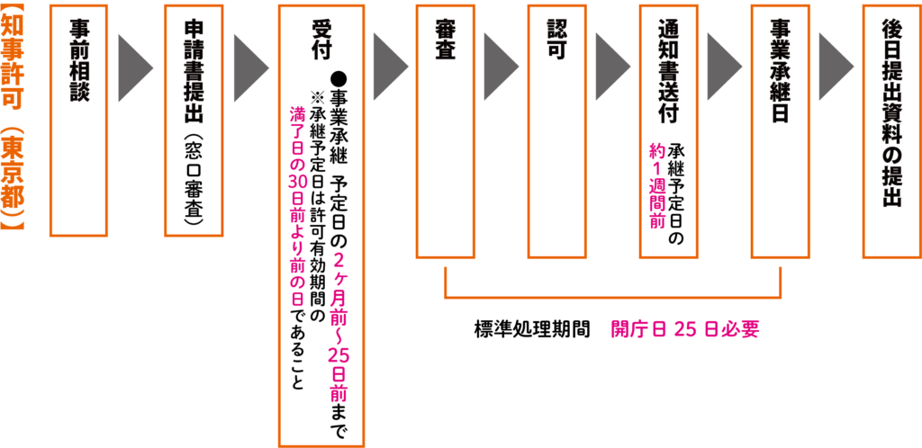 事業継承の申請受付は、都知事許可の場合は予定日の 2ヶ月〜25 日前まで、大臣許可は予定日の90日前まで。